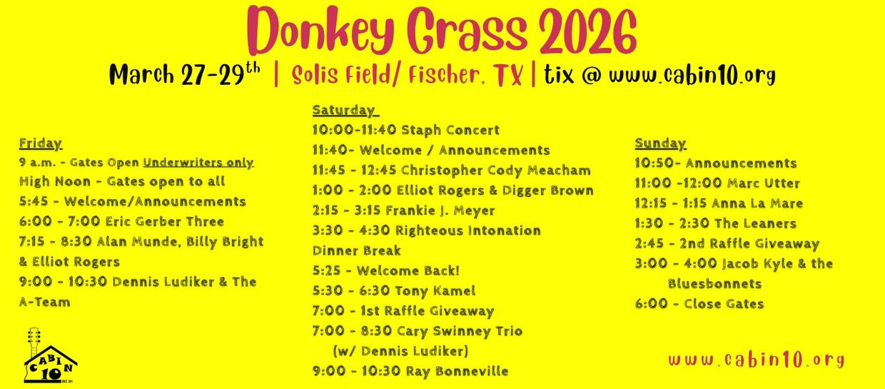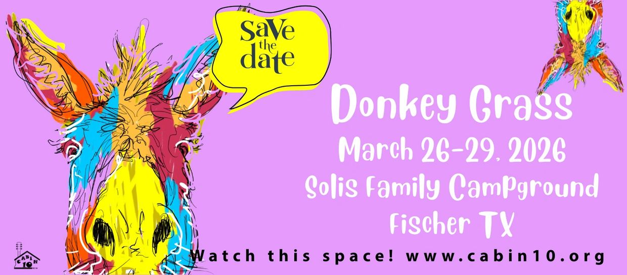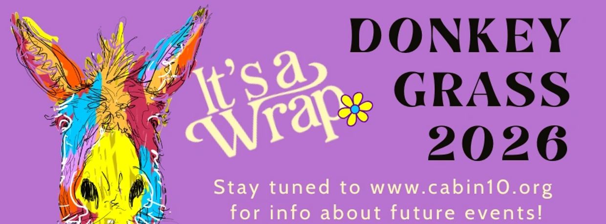You're probably thinking Donkey Grass is a funny name for a music fest, well . . . here's the backstory. Cabin 10 always used Fischer Hall for our festivals and for good reason. It's hard to beat the ambience that old structure bares, or the splendid acoustics found within its walls. Covid made rescheduling a bit tricky but we've finally landed on the 3rd weekend of November for our flagship New Folk Old Folk Festival. March, however, is solidly taken so we're going to host Donkey Grass again at the Donkey Shack (just as we did for Donkey Grass 2025) the last weekend of March. Hopefully the weather will be as stellar as it was for New Folk Old Folk but, even with last year's forecast and rainscape, the festival turned out to be wonderful. We're sure this year's will be too.