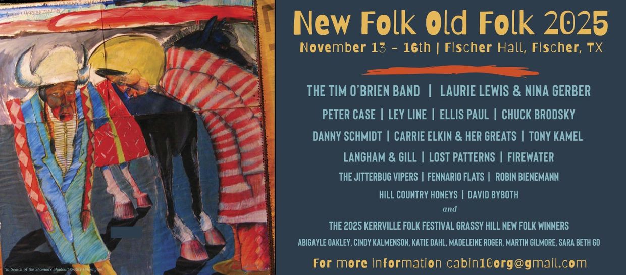 New Folk ~ Old Folk is Cabin 10’s flagship event. The name being the touchstone to what we present each year. A cycle of creativity featuring the latest winners of the Kerrville Folk Festival’s Grassy Hill New Folk Competition and a cast of seasoned artists that we’ve grown to love over the years, many former New Folk winners and Club 7. That said, and to accommodate moving NFOF to November while still highlighting the most recent, May 2024, KFF New Folk winners, we hosted an "interim" festival - "Live at the Donkey Shack" - November 15-17, 2024 at the Solis Campground, directly across from Fischer Hall.